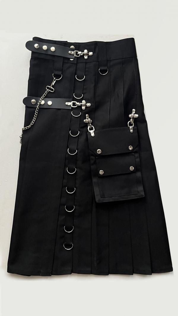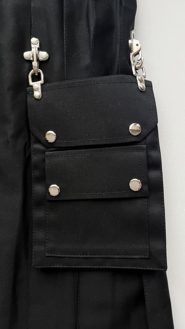 シルエットが綺麗に、はっきりと出る、しっかりと厚みのあるブラックデニム生地を使用しています。チェーンは取り外し可能。