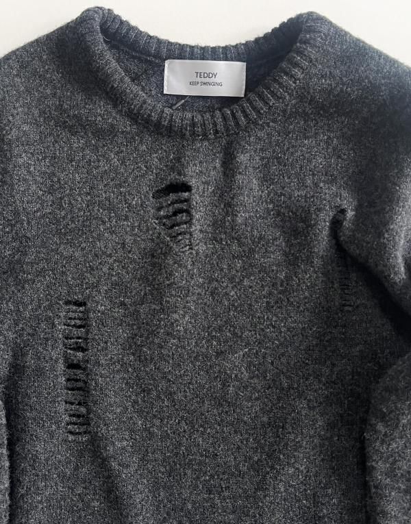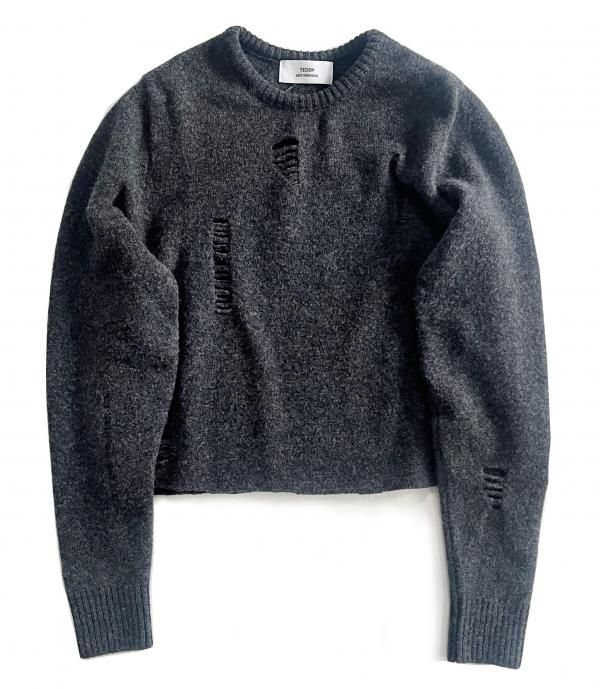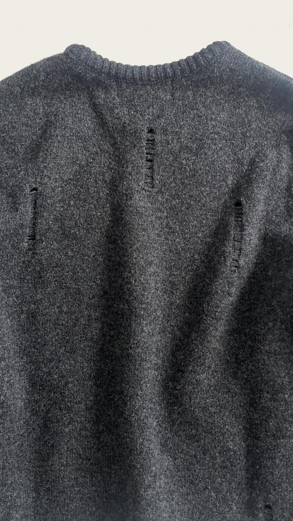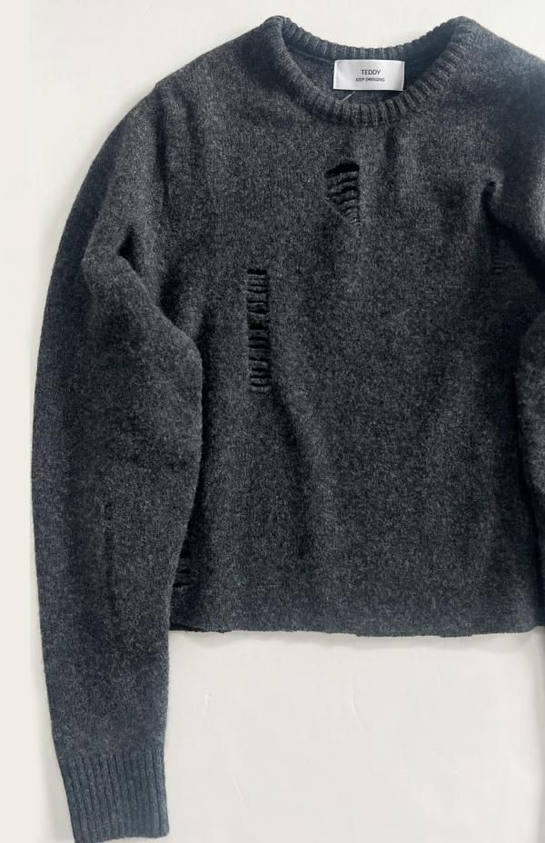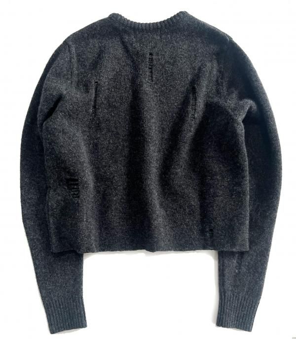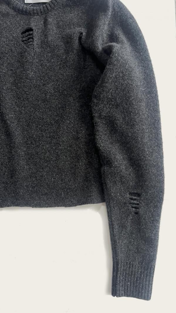 ダメージを施したニットのクロップドスタイル。裾はカットオフになっています。